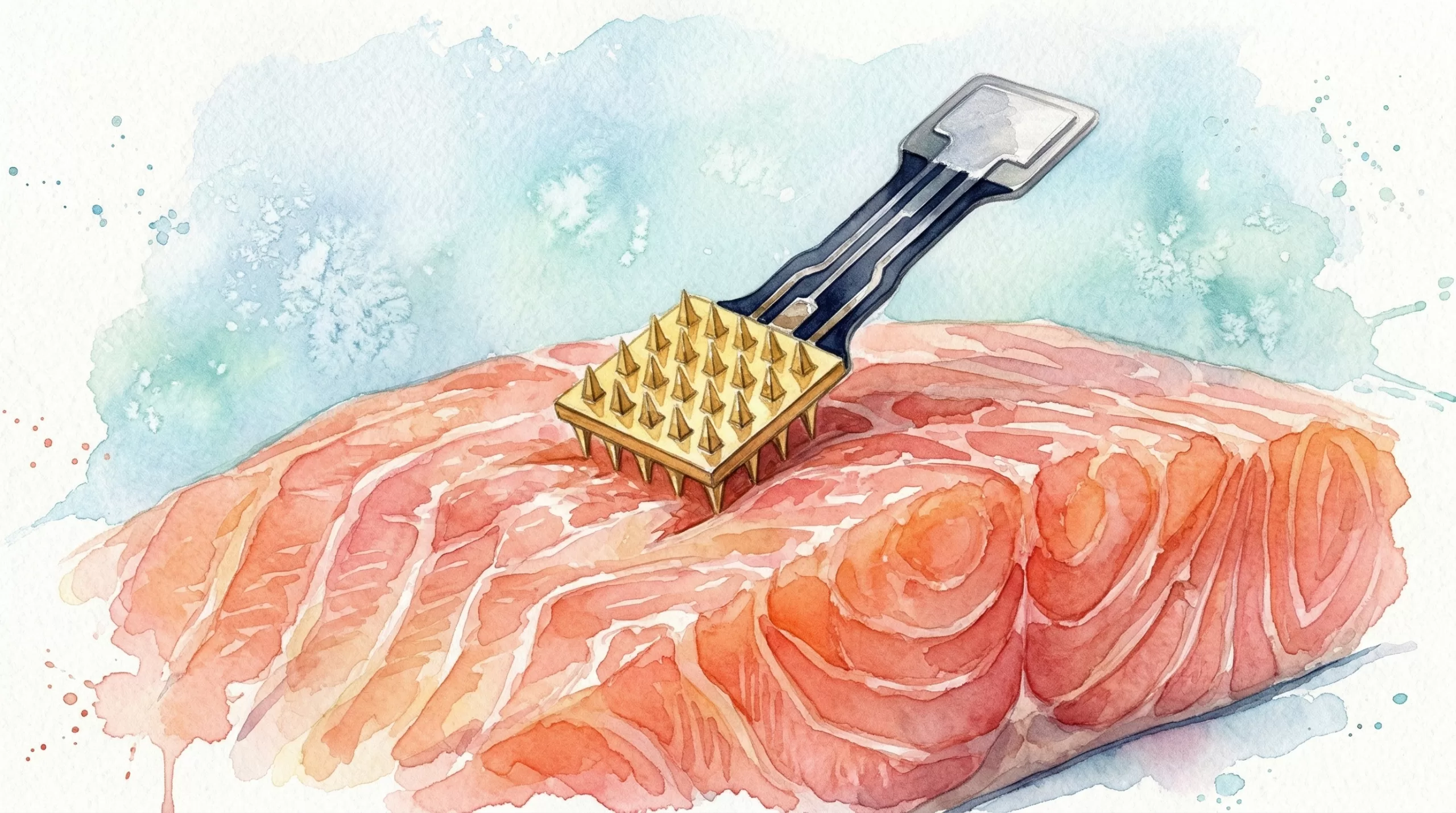 O biossensor é composto por uma matriz de microagulhas MNA produzida por técnicas de micro-fabricação avançadas, como polimerização de dois fótons e moldagem em polidimetilsiloxano (Polydimethylsiloxane, PDMS). Essa estrutura é posteriormente metalizada para formar os eletrodos essenciais à detecção eletroquímica. Ao serem pressionadas contra a superfície do peixe, as microagulhas penetram suavemente no tecido, permitindo contato direto com o ambiente interno sem danos significativos à estrutura da carne.
