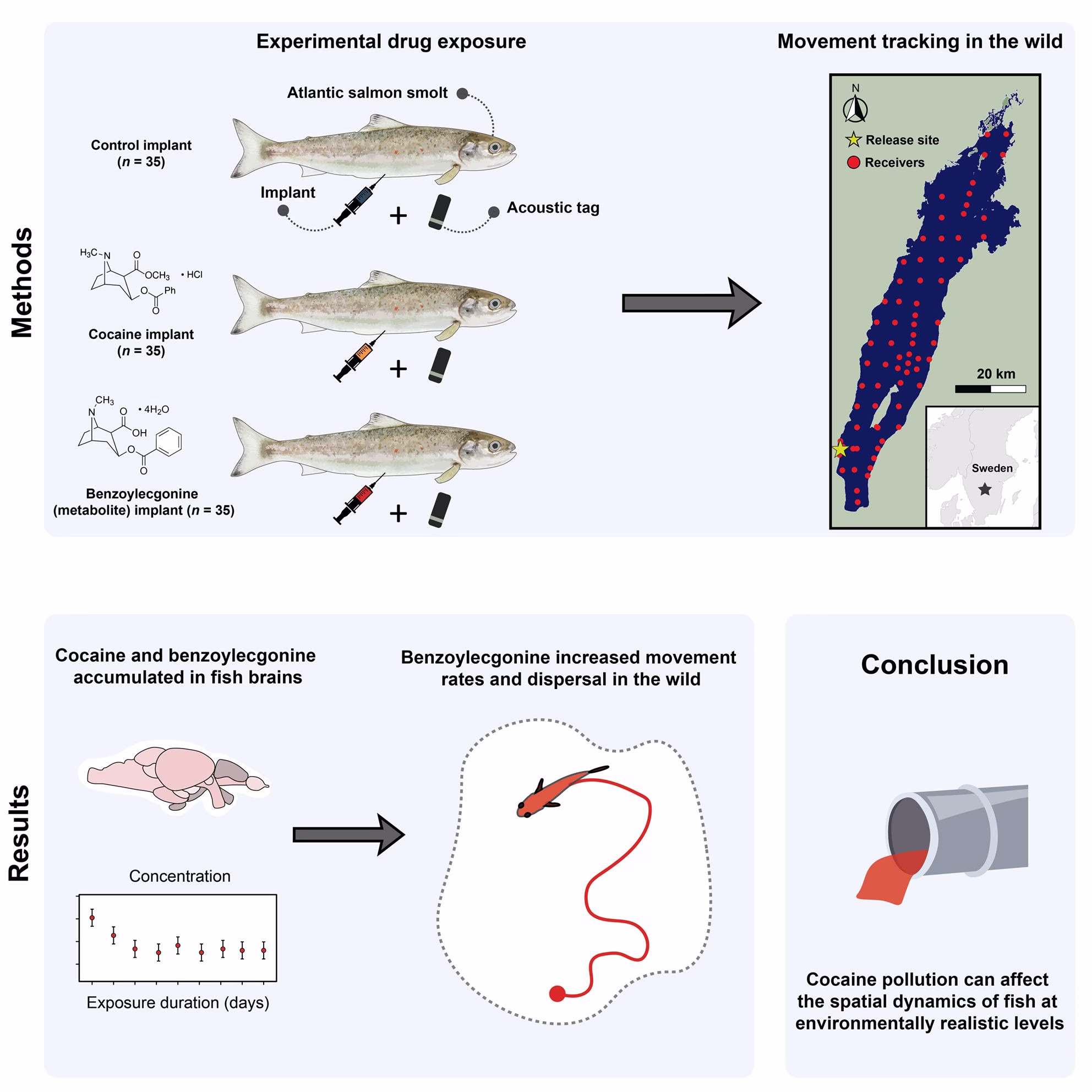 Fontes: G1 e Cocaine pollution alters the movement and space use of Atlantic salmon (Salmo salar) in a large natural lake